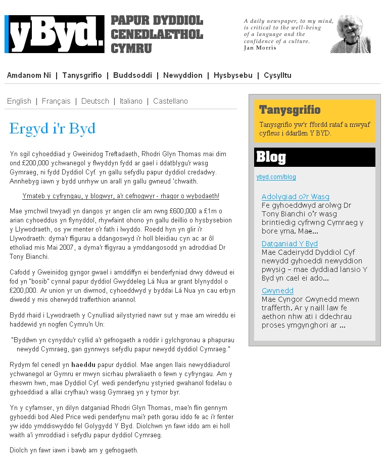 A empresa editora do Y Bid, o que puido ser o primeiro diario en papel en galés, afirma na súa web que "non somos quen de sacar adiante un diario serio cunha subvención como esta. É pouco probábel que ninguén máis o poida facer".