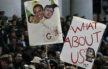 Os protagonistas da marcha foron os catro xinetes da apocalipse, nunha versión en cartón (isto é, os delitos financeiros, a guerra, o cambio climático e a falta de vivenda). Ao chegaren os manifestantes á sede do Royal Bank of Scotland -entidade que foi rescatada polo goberno de Gordon Brown-, un grupo de persoas entrou a ocupala, escachando os cristais e chegando mesmo ao tellado. Na mesma zona, a policía detivo uns manifestantes que ían vestidos con uniformes iguais aos deles, e subidos nun vehículo militar blindado. Nesta primeira protesta foron detidas, polo menos, 23 persoas.