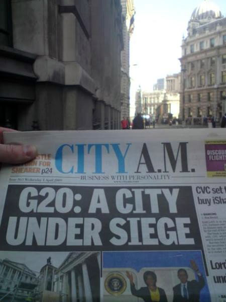 O suceso produciuse un día antes de que comece a cimeira, mentres milleiros de persoas marchaban no centro financeiro londiniense para expresar o seu rexeite ás consecuencias dos sistema capitalista. Ao berro de "abolición do diñeiro" e "morte aos banqueiros", unhas cinco mil persoas, baixo a bandeira do G20 Meltdown -referente á catástrofe que se produce ao se fusionar un reactor nuclear-, os manifestantes tentaron romper o cerco policial na zona privilexiada dos bancos, compañías de seguros e outras entidades financeiras, a Square Mail. Algunhas das fiestras das sedes destas compañías estaban xa preparadas, con táboas de madeira e outros obxectos atrancándoas. Moitos dos traballadores do centro financeiro deixaron de ir traballar esta cuarta feira, sabendo do que había pasar.