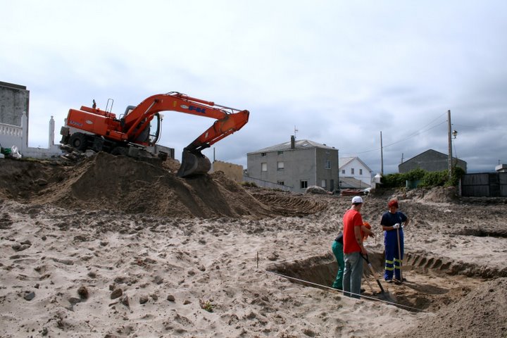 O tempo que os operarios estiveron movendo a pa retroescavadora, sen que o Concello de Cervo lles mandase a orde de parar as obras, a zona foi quedando desfeita. Os camións ían sacando area e pedras, que logo foron deitar nunha entulleira na vila de Xove. Até alí se tiveron que desprazar os técnicos da Delegación Provincial de Cultura para inventariar o que xa fora estragado. Pedras das murallas, pedras de muíño e outros restos arqueolóxicos apareceron no vertedoiro. A obra mantívose parada, así chegou a orde, un tempo, mentres un arqueólogo, contratado polo construtor, facía prospeccións na zona. Mais logo volveu comezar nunha primeira parcela na que entraran as pas.
